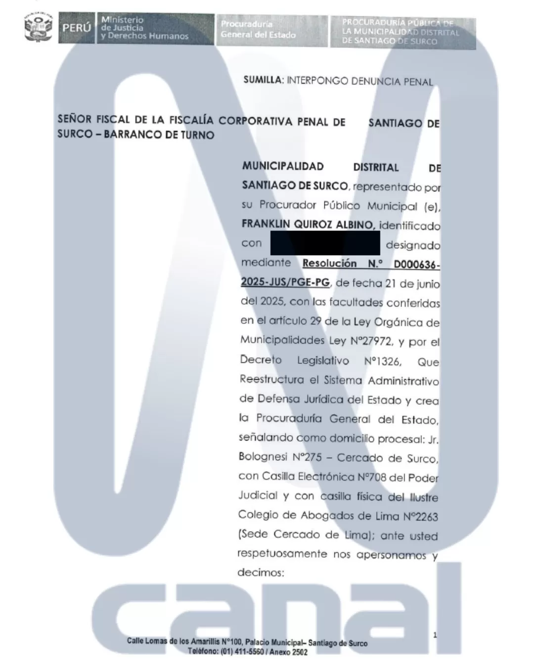 Según el documento fiscal, la Municipalidad de Surco figura a la vez como parte denunciante y agraviada en procesos paralelos.