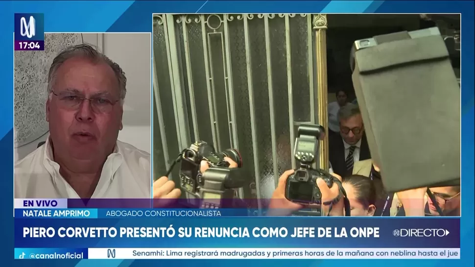 El abogado constitucionalista Natale Amprimo calificó como necesaria la salida de Piero Corvetto de la jefatura de la Oficina Nacional de Procesos Electorales (ONPE). En entrevista con Canal N, Amprimo sostuvo que era "inaceptable" que el funcionario permaneciera un día más en el cargo, debido a que su continuidad solo incrementaba las dudas y la desconfianza sobre el proceso electoral vigente.