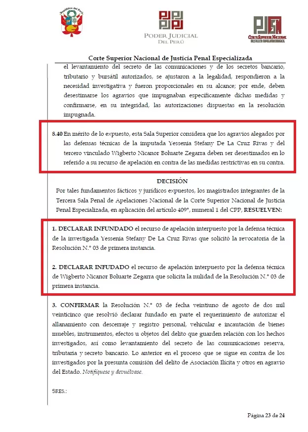 La Sala confirmó en todos sus extremos la Resolución N.º 03, manteniendo vigentes las medidas de allanamiento, incautación y levantamiento de secretos contra Nicanor Boluarte y Yessenia De La Cruz Rivas, quienes permanecerán bajo el alcance de estas disposiciones mientras se desarrollan las investigaciones.