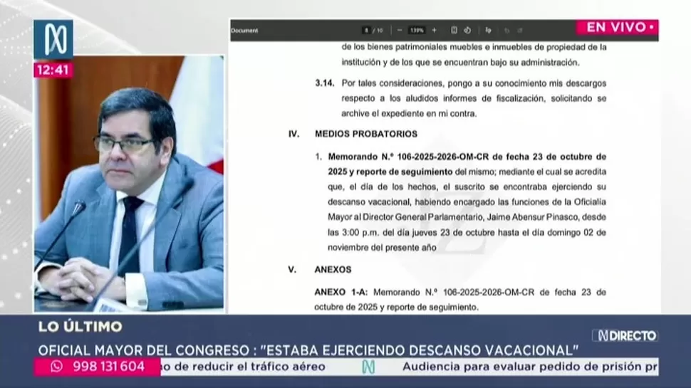 Forno precisó que su descanso vacacional abarcó desde el jueves 23 de octubre hasta el domingo 2 de noviembre. Durante ese periodo, la Oficialía Mayor fue encargada formalmente a Jaime Abensur, quien postuló al Congreso en 2021 por Fuerza Popular y actualmente ocupa el cargo de director general parlamentario.