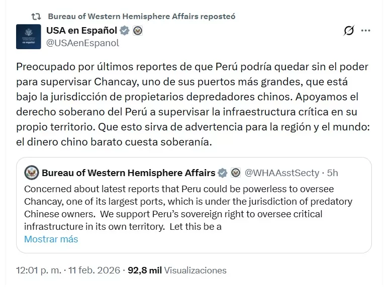 La Oficina de Asuntos del Hemisferio Occidental indicó que respalda el derecho soberano del Perú a supervisar su infraestructura crítica. El mensaje fue publicado en la red social X.