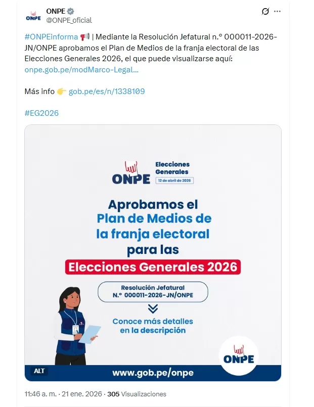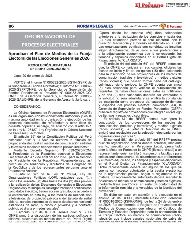 La Oficina Nacional de Procesos Electorales (ONPE) aprobó el Plan de Medios de la franja electoral para las Elecciones Generales 2026. El documento oficial fue publicado mediante la Resolución Jefatural Nº 000011-2026-JN/ONPE en el boletín de Normas Legales del Diario El Peruano. El objetivo de este plan es garantizar que las organizaciones políticas puedan difundir sus propuestas en condiciones de igualdad.
