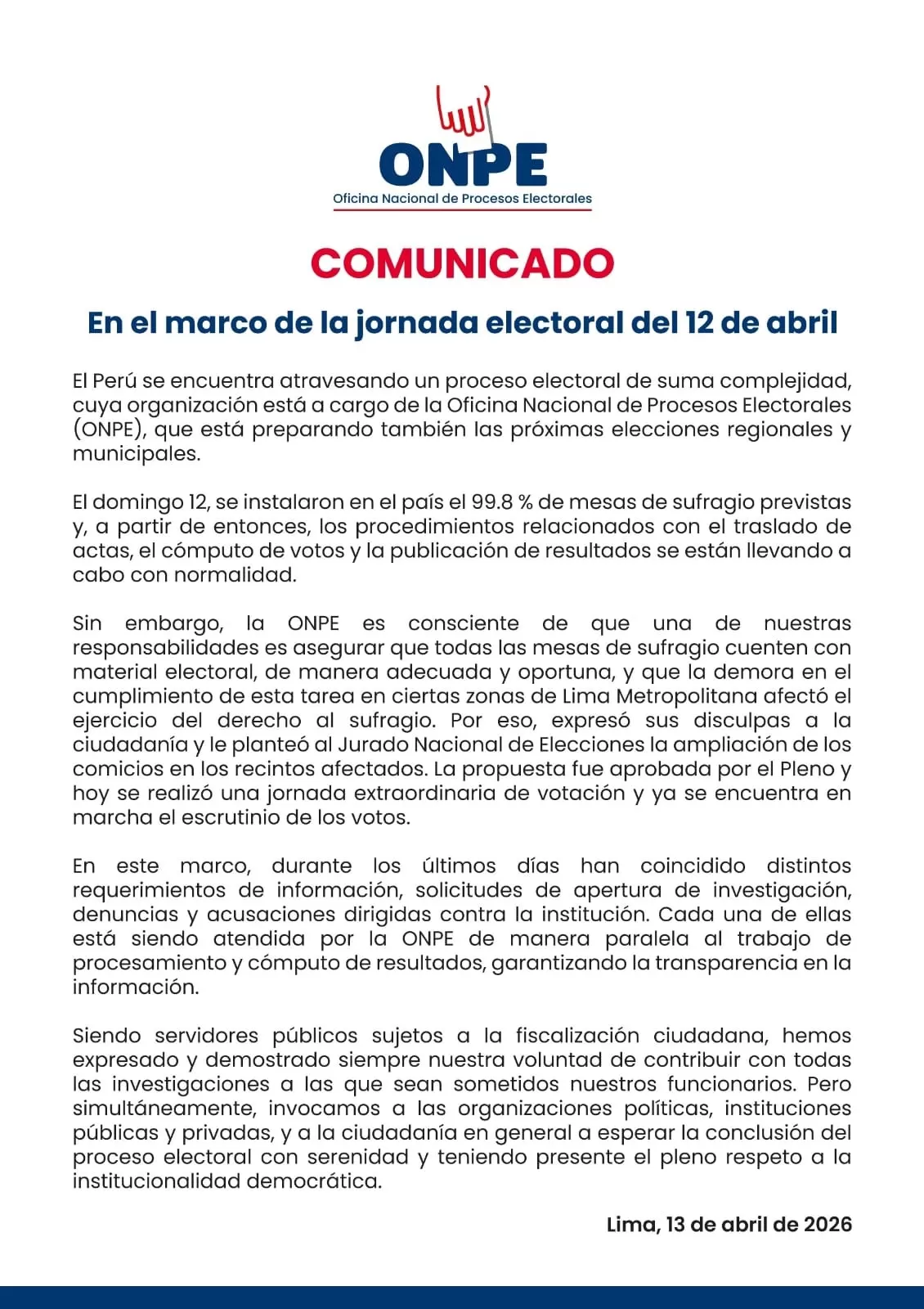 La ONPE emitió un comunicado informando que atiende denuncias e investigaciones de manera paralela al conteo de votos tras los retrasos en las mesas de sufragio. El organismo reconoció fallas logísticas en Lima Metropolitana y pidió disculpas a la ciudadanía por la afectación al derecho al sufragio. El JNE ha denunciado penalmente al jefe de la ONPE, Piero Corvetto, por presuntos delitos de omisión de funciones y atentado contra el sufragio. La institución ratificó su voluntad de colaborar con la Fiscalía mientras avanza el escrutinio de la jornada extraordinaria realizada este lunes en los distritos afectados.