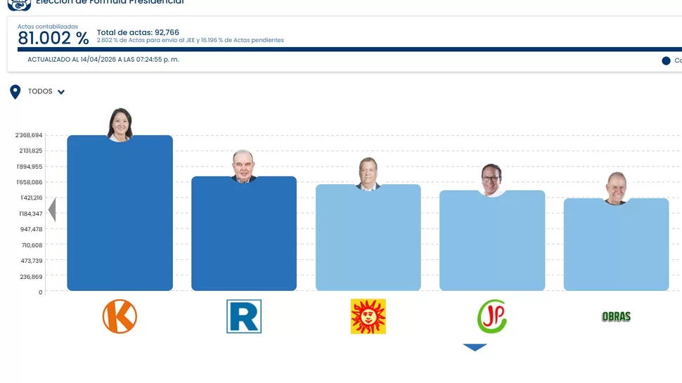 La Oficina Nacional de Procesos Electorales (ONPE) informó un nuevo avance del conteo oficial de votos al 81.481 % de actas contabilizadas, confirmando que Keiko Fujimori se mantiene en el primer lugar de la contienda presidencial.