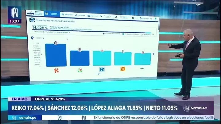 La ONPE actualizó el conteo de votos al 91.592% de actas contabilizadas, ubicando a Keiko Fujimori y Roberto Sánchez en los dos primeros puestos de la elección.