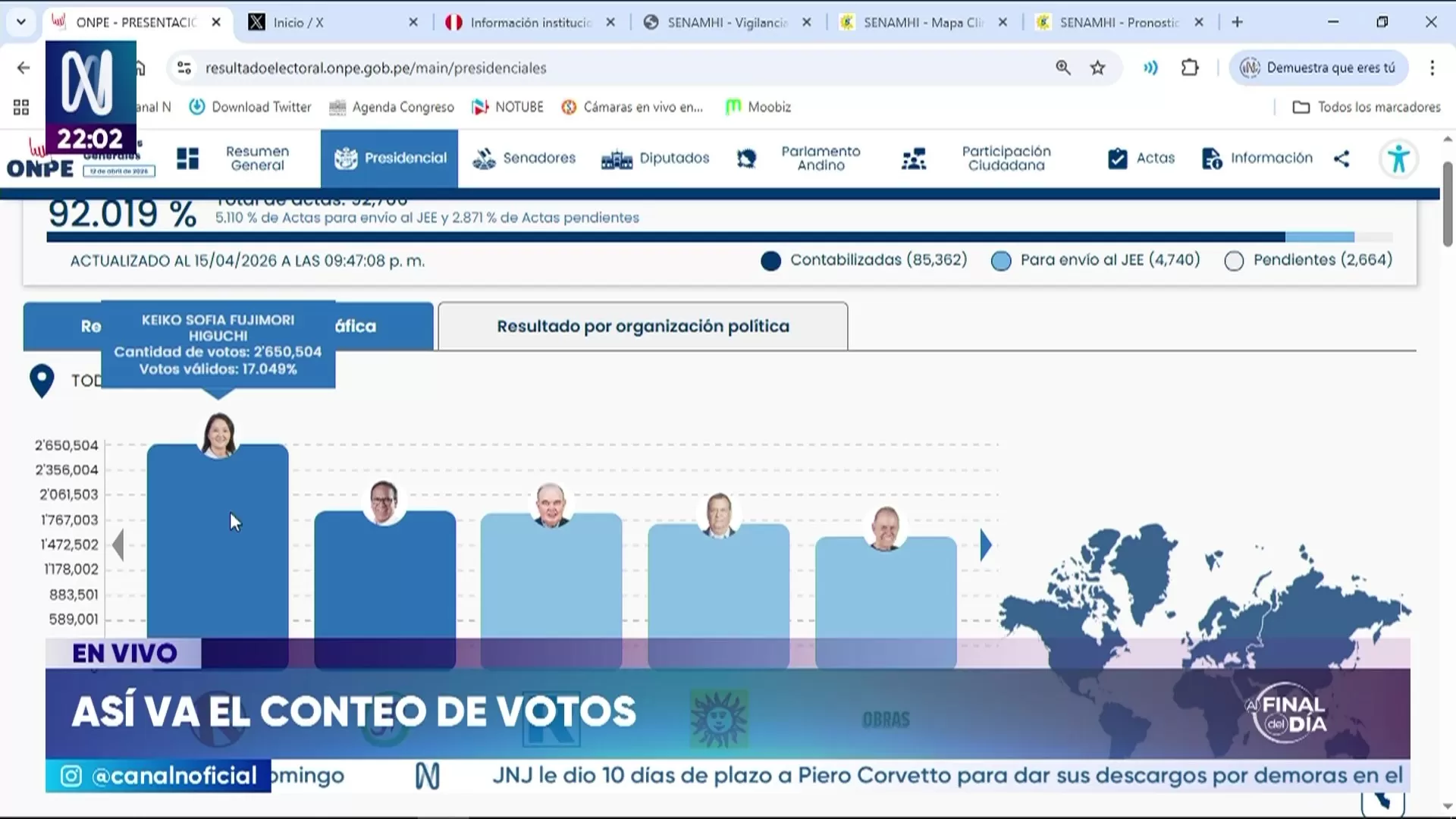 El reporte de la ONPE detalla que la lideresa de Fuerza Popular alcanza un 17.154% de los votos válidos escrutados hasta el momento. En la segunda posición se encuentra el candidato de Renovación Popular, Rafael López Aliaga, quien registra un 16.540%. Estos resultados oficiales marcan una tendencia inicial mientras el organismo electoral continúa con el procesamiento del material en sus centros de cómputo.