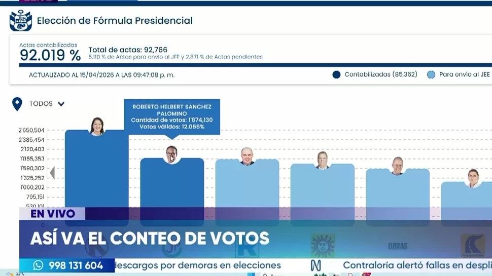 La ONPE actualizó el conteo de votos al 91.847 % de actas contabilizadas, ubicando a Keiko Fujimori y Roberto Sánchez en los dos primeros puestos de la elección.