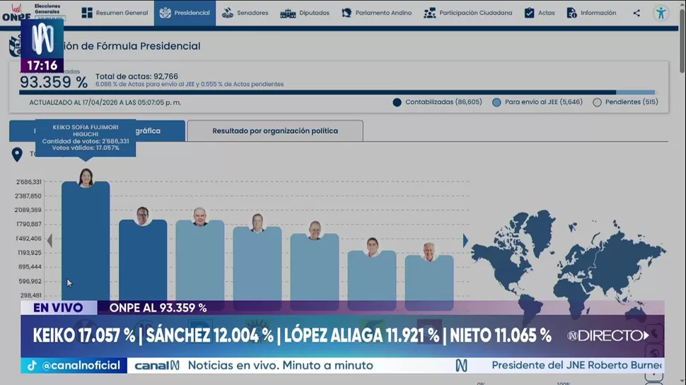 El reporte de la ONPE detalla que la lideresa de Fuerza Popular alcanza un 17.154% de los votos válidos escrutados hasta el momento. En la segunda posición se encuentra el candidato de Renovación Popular, Rafael López Aliaga, quien registra un 16.540%. Estos resultados oficiales marcan una tendencia inicial mientras el organismo electoral continúa con el procesamiento del material en sus centros de cómputo.