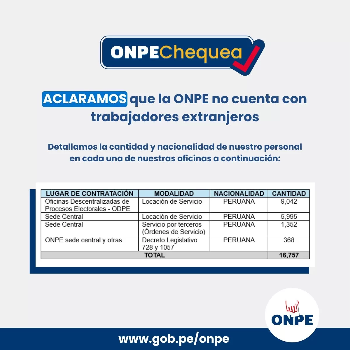 La Oficina Nacional de Procesos Electorales aclaró, a través de un comunicado difundido en sus redes sociales, que no cuenta con trabajadores extranjeros en su institución, en respuesta a versiones que circulaban sobre la composición de su personal.