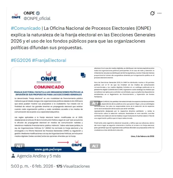 Mediante un comunicado difundido este 6 de febrero, la ONPE precisó que su rol se limita a la regulación, gestión y contratación con los medios elegidos por las organizaciones políticas, conforme a lo establecido en la Constitución y la Ley de Organizaciones Políticas.