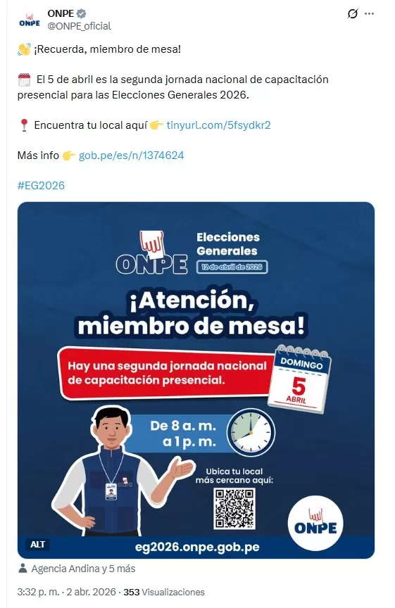 La ONPE informó que el 37.8% de miembros de mesa ha sido capacitado a nivel nacional, lo que equivale a 315 208 ciudadanos, a pocos días de las elecciones generales. El organismo anunció una segunda jornada de capacitación para el 5 de abril en 4211 locales en todo el país. Los ciudadanos pueden capacitarse de forma presencial o virtual a través de ONPEduca. Quienes cumplan esta función recibirán una compensación de S/ 165 y un día de descanso remunerado. Además, se ha capacitado a 1185 personeros de 26 organizaciones políticas.