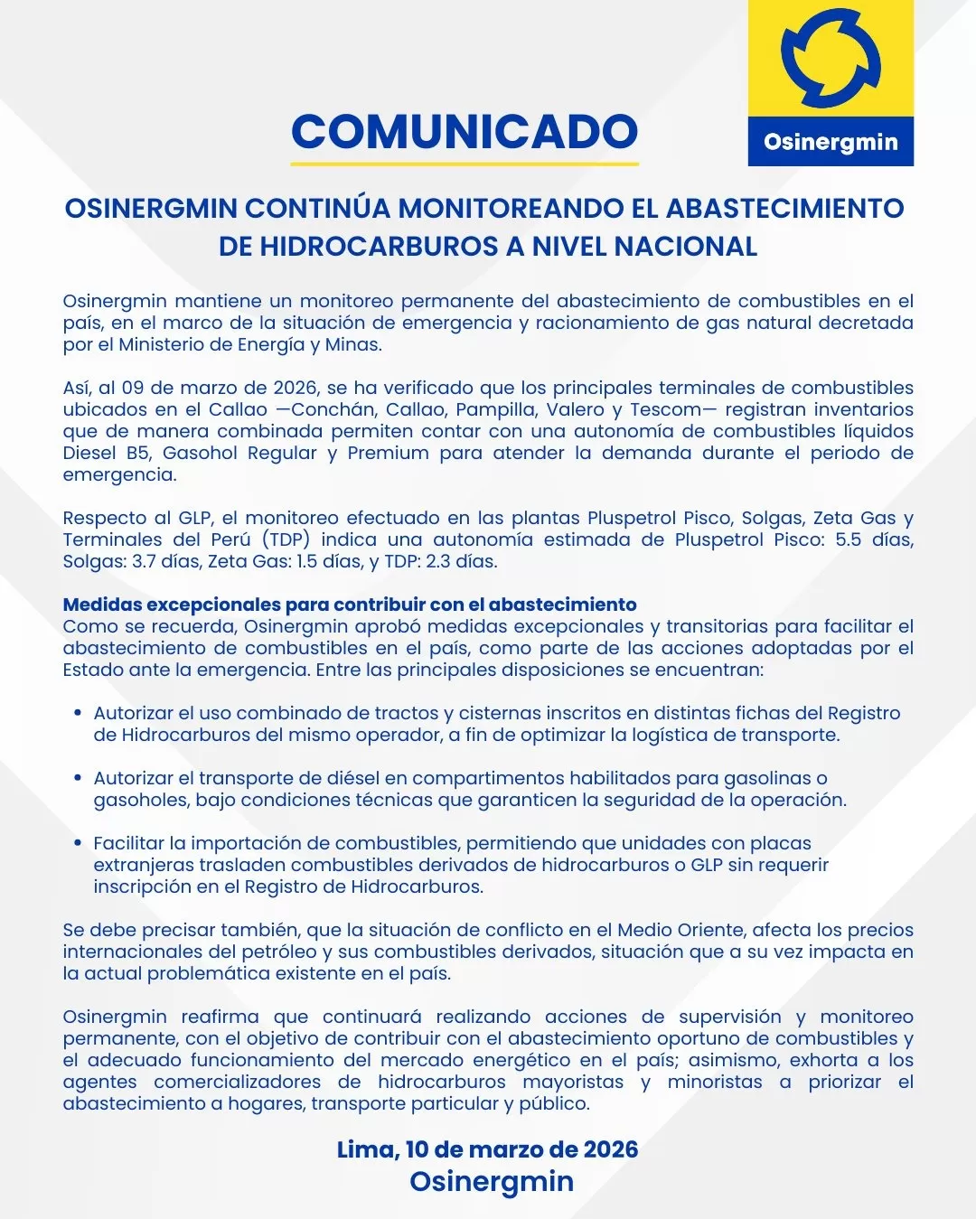 Osinergmin informó que mantiene monitoreo permanente del abastecimiento de combustibles en el país durante la emergencia y racionamiento de gas natural decretados por el Ministerio de Energía y Minas. La supervisión incluye terminales de combustibles del Callao y plantas de GLP como Pluspetrol Pisco, Solgas, Zeta Gas y Terminales del Perú. Según la entidad, los inventarios combinados permiten contar con autonomía de combustibles líquidos para atender la demanda durante la emergencia. También se aprobaron medidas excepcionales para transporte e importación de combustibles. Osinergmin señaló que continuará supervisando el mercado energético y exhortó a priorizar el abastecimiento a hogares y transporte.