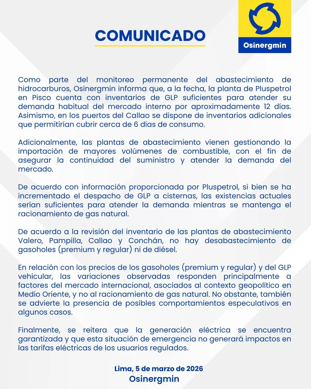 El regulador Osinergmin informó que actualmente no existe desabastecimiento de GLP, gasoholes ni diésel en el país. La entidad indicó que los inventarios disponibles permiten atender la demanda mientras se mantiene el racionamiento de gas natural tras la interrupción del transporte de gas.
