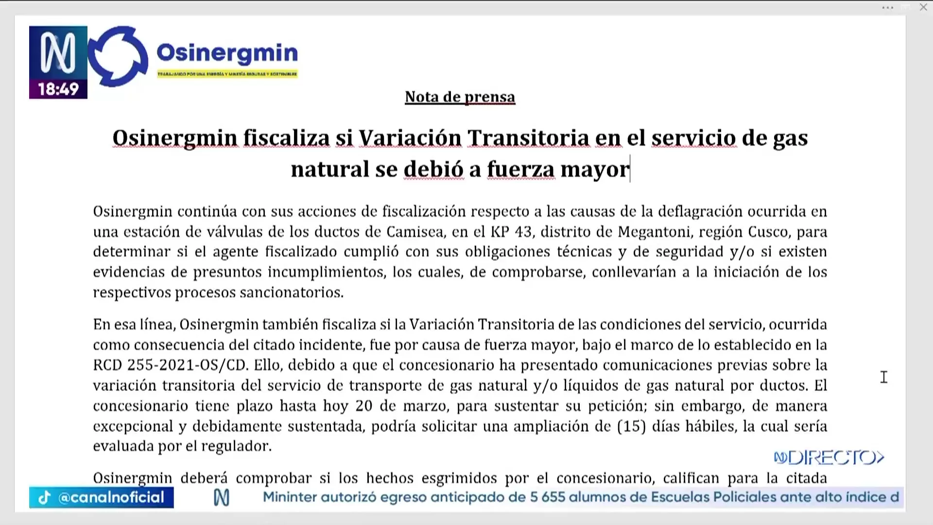 El Organismo Supervisor de la Inversión en Energía y Minería (Osinergmin) informó que mantiene las acciones de fiscalización para determinar las causas de la deflagración ocurrida en una estación de válvulas de los ductos de Camisea, en el KP 43, ubicado en el distrito de Megantoni, en Cusco. La entidad señaló que la investigación busca establecer si el concesionario cumplió con sus obligaciones técnicas y de seguridad tras el incidente que derivó en una crisis del gas.