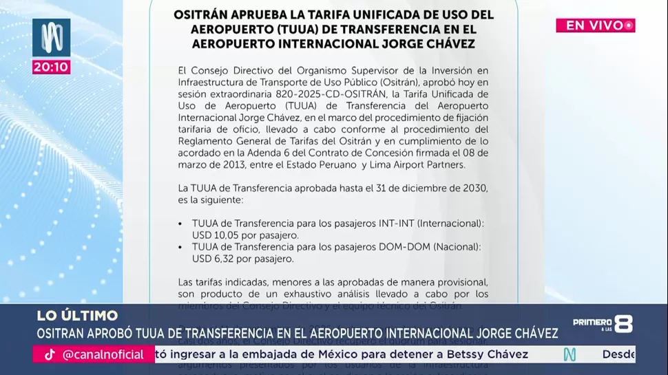 Ositran determinó que el costo para los pasajeros de vuelos internacionales será de 10.05 dólares por persona, mientras que para los pasajeros nacionales la tarifa se fijó en 6.32 dólares. Según el comunicado emitido, estos montos definitivos son inferiores a las cifras que se habían aprobado inicialmente de manera provisional, producto de un ajuste basado en el análisis exhaustivo realizado por el equipo técnico y el Consejo Directivo.