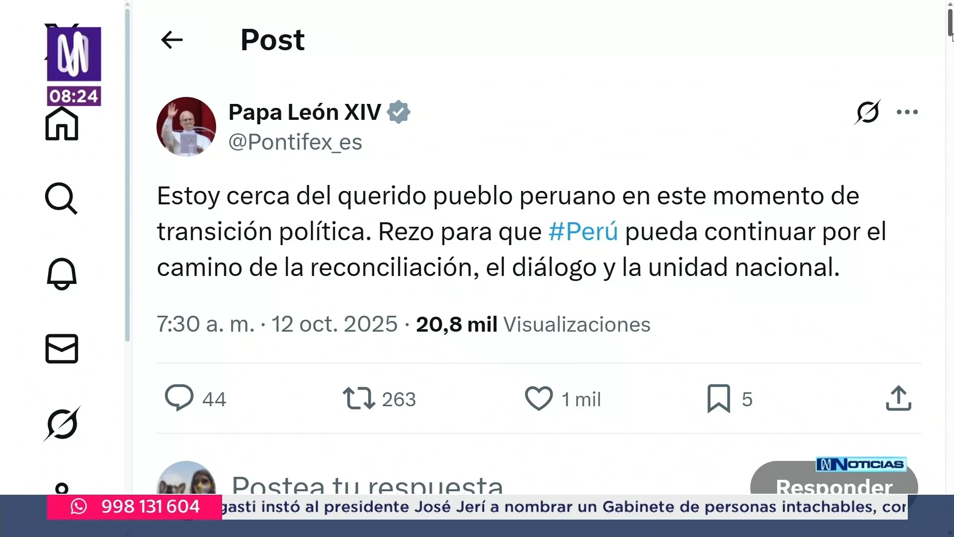Su mensaje coincidió con un domingo de expectativa nacional tras la juramentación de un nuevo Gobierno interino. Desde la plaza de San Pedro, el pontífice pidió mantener la confianza y trabajar colectivamente por un futuro más estable.