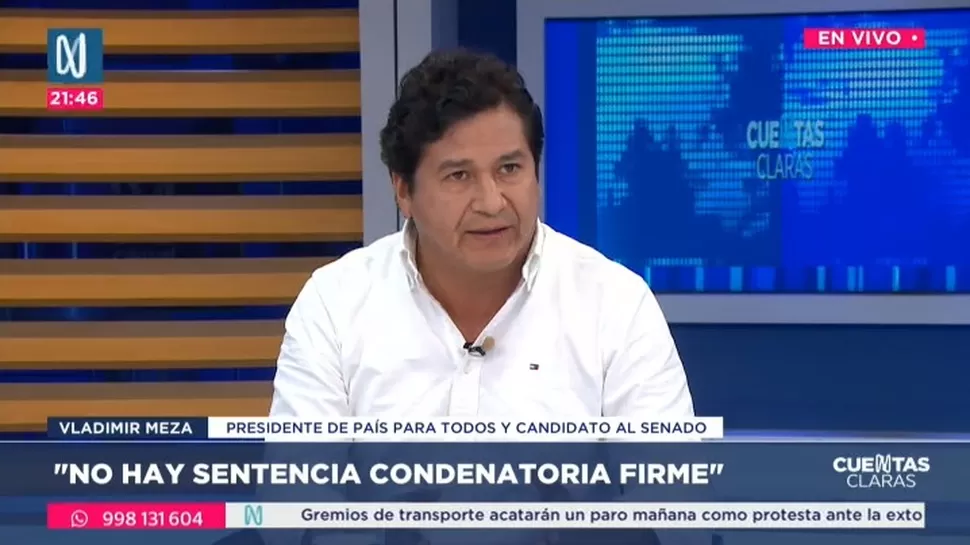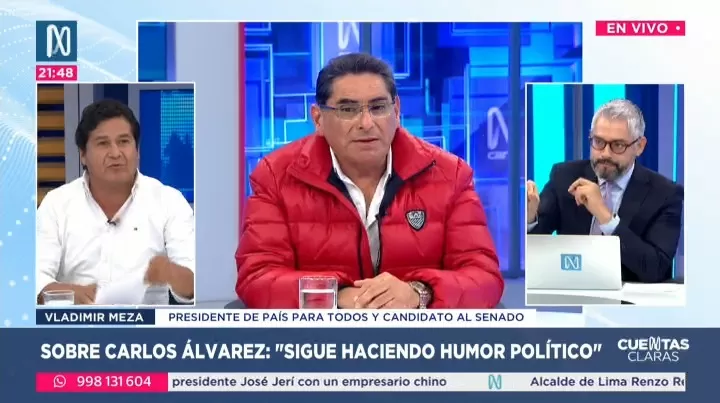 El presidente del partido País Para Todos, Vladimir Meza, confirmó que la organización sí estaba informada del proceso judicial que enfrentó su candidato presidencial Carlos Álvarez por presunto peculado. Indicó que el tema fue evaluado al momento de aceptar su postulación y que la sentencia fue anulada por la Corte Suprema en 2007.