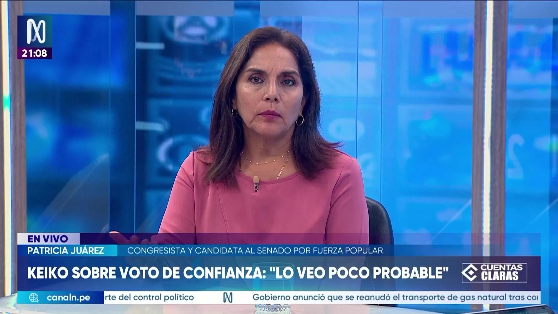 Durante la conversación en el programa Cuentas Claras, Patricia Juárez también se pronunció sobre el próximo voto de confianza al gabinete de Denisse Miralles, la situación del gobierno encabezado por José María Balcázar y las declaraciones del candidato Wolfgang Grozo sobre sus reuniones con Zamir Villaverde. La parlamentaria indicó que Fuerza Popular todavía no tiene una decisión definitiva sobre el respaldo al gabinete.
