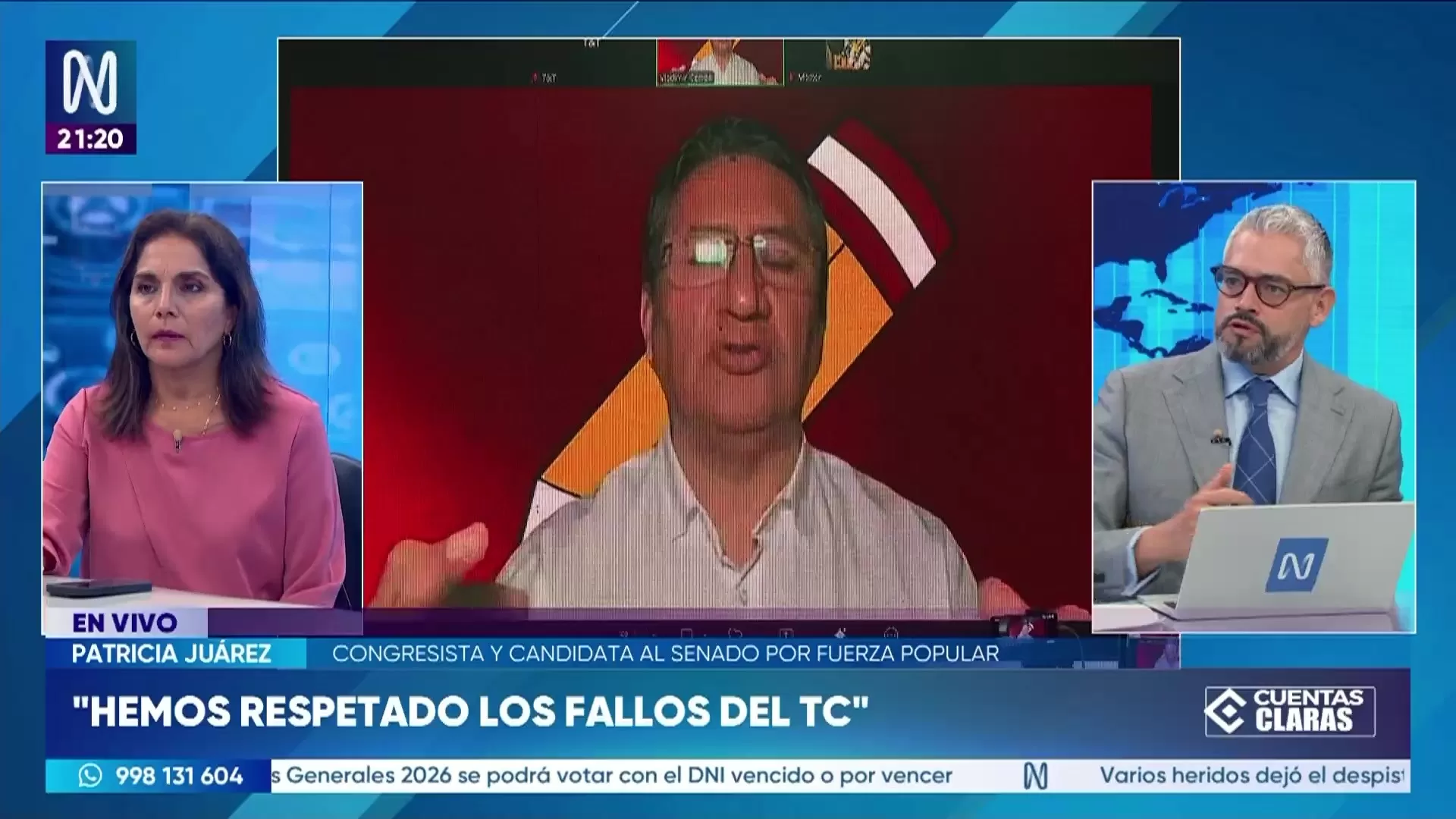Patricia Juárez afirmó en Canal N que no considera al Tribunal Constitucional como un actor dentro del panorama político tras dejar al voto el recurso de Vladimir Cerrón para anular su prisión preventiva. La congresista sostuvo que Fuerza Popular respeta los fallos del TC y que no tiene cercanía con Cerrón. Además, indicó que su bancada aún no ha tomado una decisión firme sobre el voto de confianza al gabinete de Denisse Miralles. Juárez también cuestionó al gobierno de José María Balcázar por improvisación y desorganización. Finalmente, criticó a Wolfgang Grozo y dijo que subestima a los peruanos por sus explicaciones sobre reuniones con Zamir Villaverde.