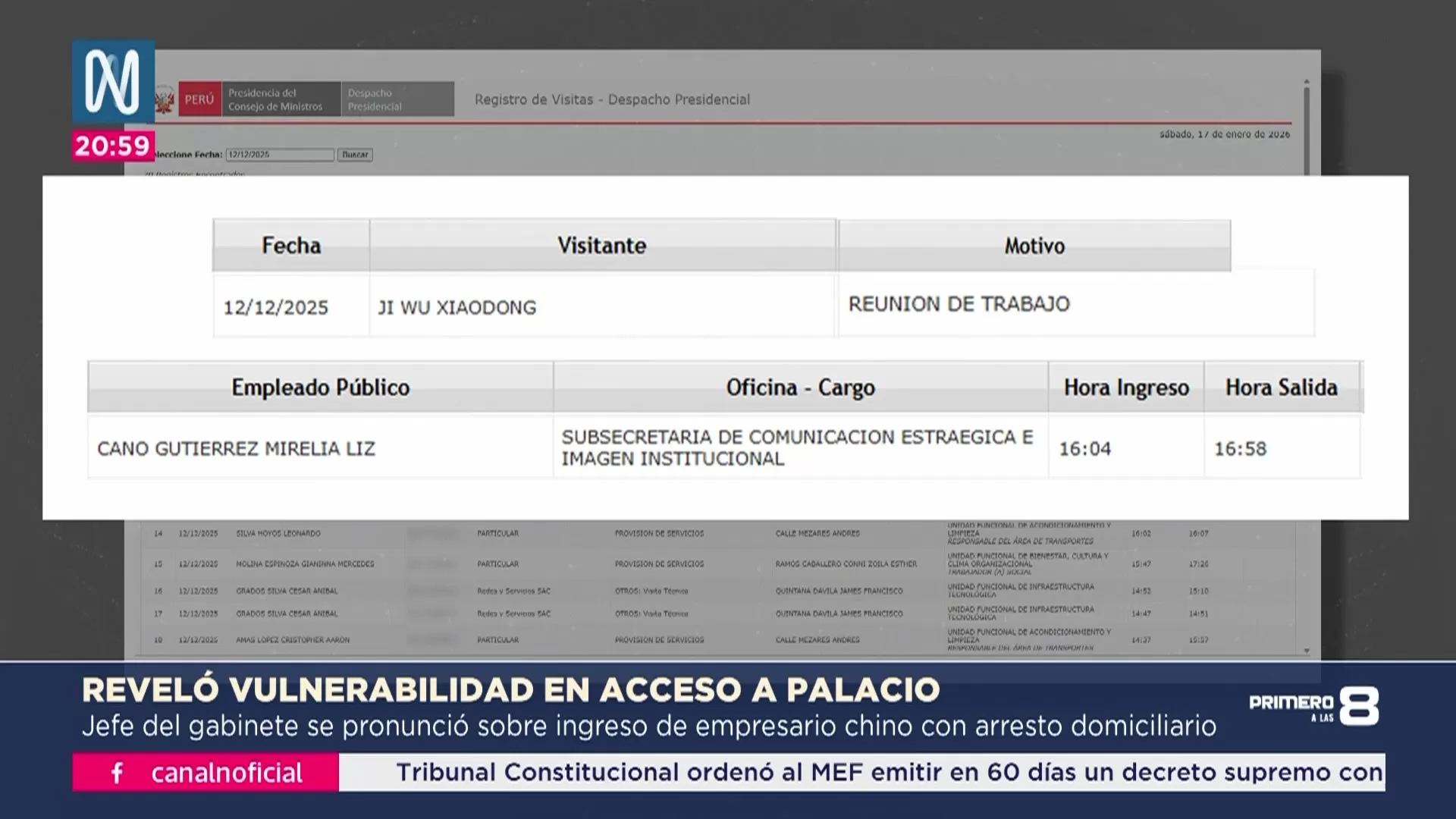 El presidente del Consejo de Ministros, Ernesto Álvarez, reconoció que actualmente Palacio de Gobierno no cuenta con ningún sistema para verificar los antecedentes de las personas que ingresan a reunirse con el presidente José Jerí. La afirmación fue realizada tras la revelación de reuniones entre el jefe de Estado y Ji Wu Xiaodong, empresario chino con arresto domiciliario por presunto tráfico ilegal de madera.