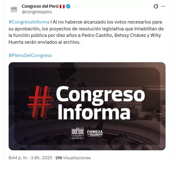 El Congreso rechazó la propuesta de inhabilitar a Pedro Castillo por diez años por no alcanzar los votos necesarios: 44 a favor, 31 en contra y 3 abstenciones. Desde el penal Barbadillo, el exmandatario aseguró que lo acusan por no ceder ante la élite económica. Su abogado argumentó que ya existe una sanción previa y advirtió vulneración del principio de doble sanción. En paralelo, el Congreso escuchó la defensa de Betssy Chávez, cuya intervención finalizó en la expulsión de su abogado tras declaraciones ofensivas. La sanción contra Castillo no se aplicará al no contar con respaldo mayoritario.