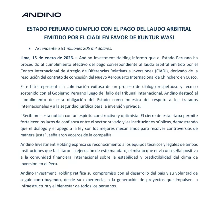 El Estado peruano cumplió con el pago del laudo arbitral del CIADI a favor del consorcio Kuntur Wasi por el caso del Aeropuerto Internacional de Chinchero. Así lo informó la empresa Andino Investment Holding, integrante del consorcio, que confirmó el desembolso de 91 millones 205 mil dólares, correspondiente a la indemnización establecida por el tribunal internacional.