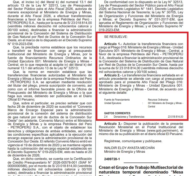 La medida fue formalizada mediante la Resolución Ministerial 129-2026-MINEM/DM, publicada el 26 de marzo. El documento establece el destino de los recursos.