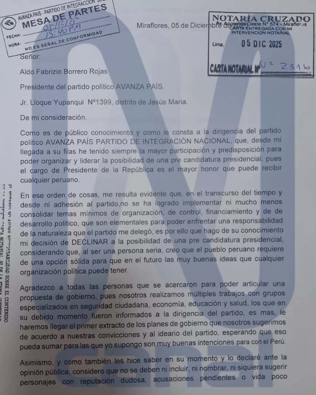 Phillip Butters presentó dos cartas notariales el 5 de diciembre para comunicar su renuncia irrevocable a Avanza País y el retiro de su precandidatura presidencial. En sus declaraciones, criticó la falta de estructura interna, financiamiento y control en el partido. Cuestionó además la presencia de figuras con antecedentes judiciales en el entorno partidario. Confirmó que desarrolló propuestas técnicas con especialistas, que serán entregadas como aporte. También señaló que no tuvo comunicación reciente con la dirigencia por su ausencia en el país. La renuncia fue confirmada por el partido y enviada al Registro de Organizaciones Políticas para su formalización.