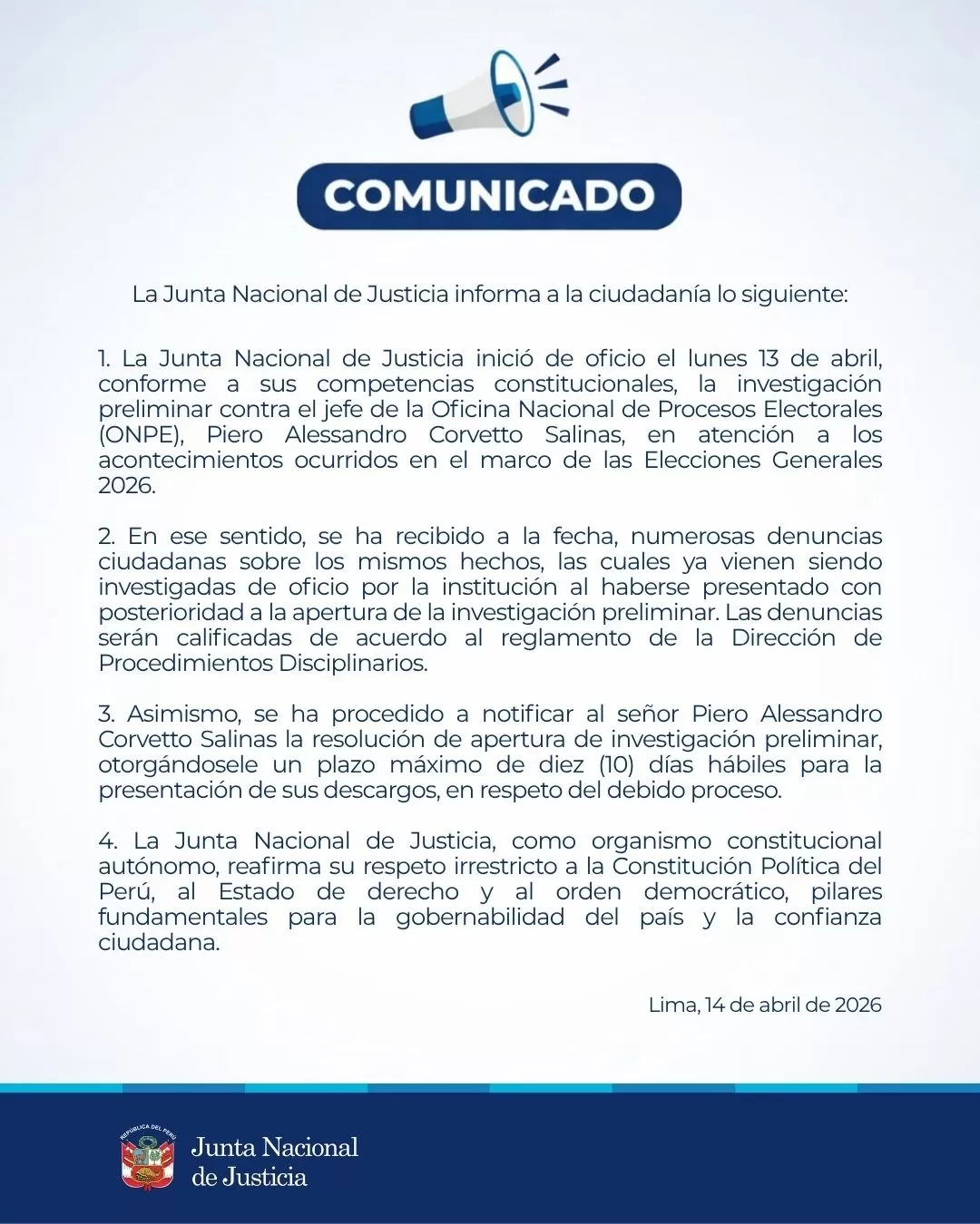 La Junta Nacional de Justicia reafirmó su respeto irrestricto a la Constitución Política del Perú y a los pilares de la gobernabilidad. El proceso contra Piero Corvetto continuará con la revisión de los descargos que el jefe de la ONPE presente dentro del plazo máximo establecido de diez días.