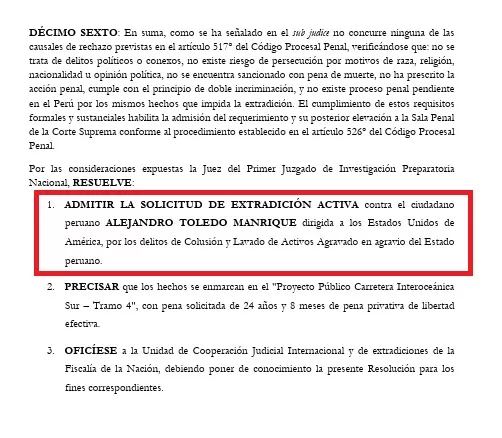 El caso pasará ahora a la Corte Suprema, que deberá emitir su opinión. Si la decisión es ratificada, el Ejecutivo, a través del Ministerio de Justicia y el Ministerio de Relaciones Exteriores, formalizará la solicitud a Estados Unidos. La defensa legal de Toledo podría impugnar esta decisión.
