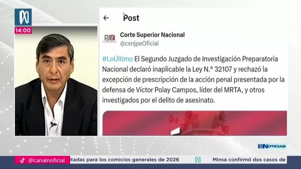 El Segundo Juzgado de Investigación Preparatoria Nacional del Poder Judicial resolvió declarar inaplicable la Ley 32107 y rechazó el pedido de prescripción de la acción penal formulado por la defensa de Víctor Polay Campos, líder histórico del Movimiento Revolucionario Túpac Amaru (MRTA). La decisión mantiene vigente el proceso penal en su contra por el presunto delito de asesinato.