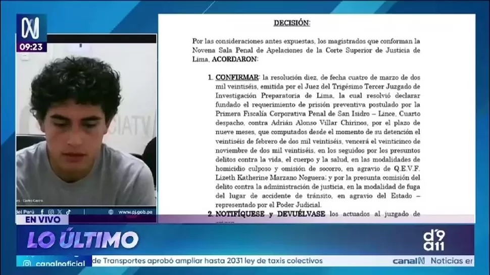 La Novena Sala de Apelaciones de la Corte Superior de Justicia de Lima confirmó la resolución emitida el 4 de marzo de 2026 por el Trigésimo Tercer Juzgado de Investigación Preparatoria de Lima. Dicha resolución declaró fundado el requerimiento de prisión preventiva contra Adrián Alonso Villar Chirinos.