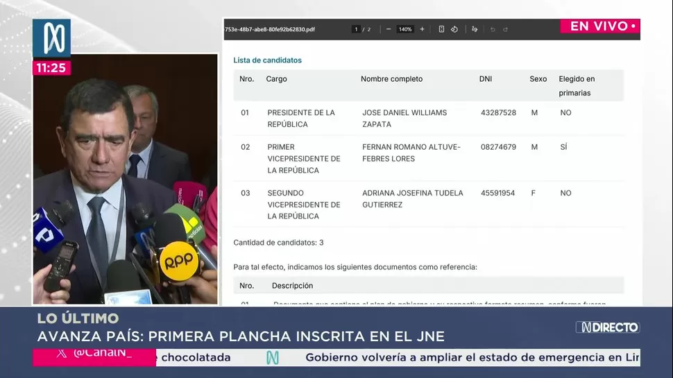 La plancha presidencial del partido Avanza País, encabezada por el ex presidente del Congreso José Williams, fue la primera en ser inscrita oficialmente ante el Jurado Nacional de Elecciones (JNE) con miras a las elecciones generales de 2026. La solicitud fue presentada este martes 19 de diciembre a las 10:15 a.m., según el documento suscrito por el personero legal del partido, Aldo Fabricio Borrero Rojas.
