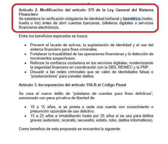 El segundo eje del proyecto contempla la modificación de la Ley General del Sistema Financiero para establecer que toda apertura de cuentas bancarias, billeteras digitales o servicios financieros electrónicos requiera verificación biofacial y biométrica obligatoria.