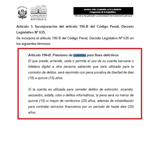 La congresista María del Carmen Alva presentó un proyecto que propone sancionar el préstamo de cuentas y aplicar verificación biométrica para frenar delitos como la extorsión y el sicariato.