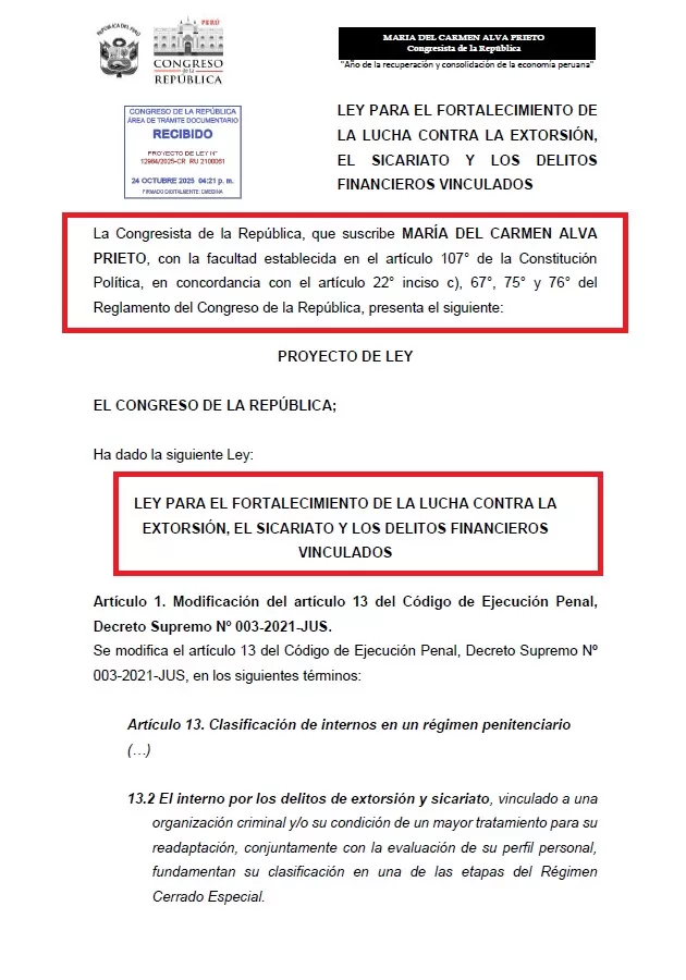 La congresista María del Carmen Alva presentó un proyecto de ley que busca incorporar nuevas herramientas legales para enfrentar la extorsión, sicariato y delitos financieros asociados al crimen organizado. La propuesta plantea reformas en el Código Penal, el sistema financiero y el régimen penitenciario, enfocándose en la prevención del uso indebido de cuentas bancarias y la contención de operaciones criminales desde los penales.