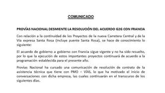 En paralelo, se dio a conocer un oficio de Provías Nacional dirigido a la empresa EGIS VIA S.A.S., en el que se establece que cualquier información dirigida a los medios sobre proyectos bajo la modalidad gobierno a gobierno debe contar con autorización previa de Provías Nacional y del Ministerio de Transportes y Comunicaciones.