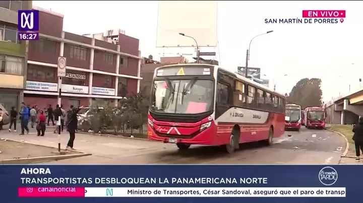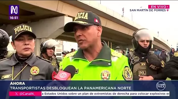 La Policía Nacional del Perú (PNP) informó que la Panamericana Norte fue desbloqueada y el tránsito restablecido tras el paro de transportistas que afectó varias zonas de Lima este lunes 6 de octubre. Así lo comunicó el general Manuel Vidarte, director de Tránsito, Transporte y Seguridad Vial, en declaraciones a Canal N.