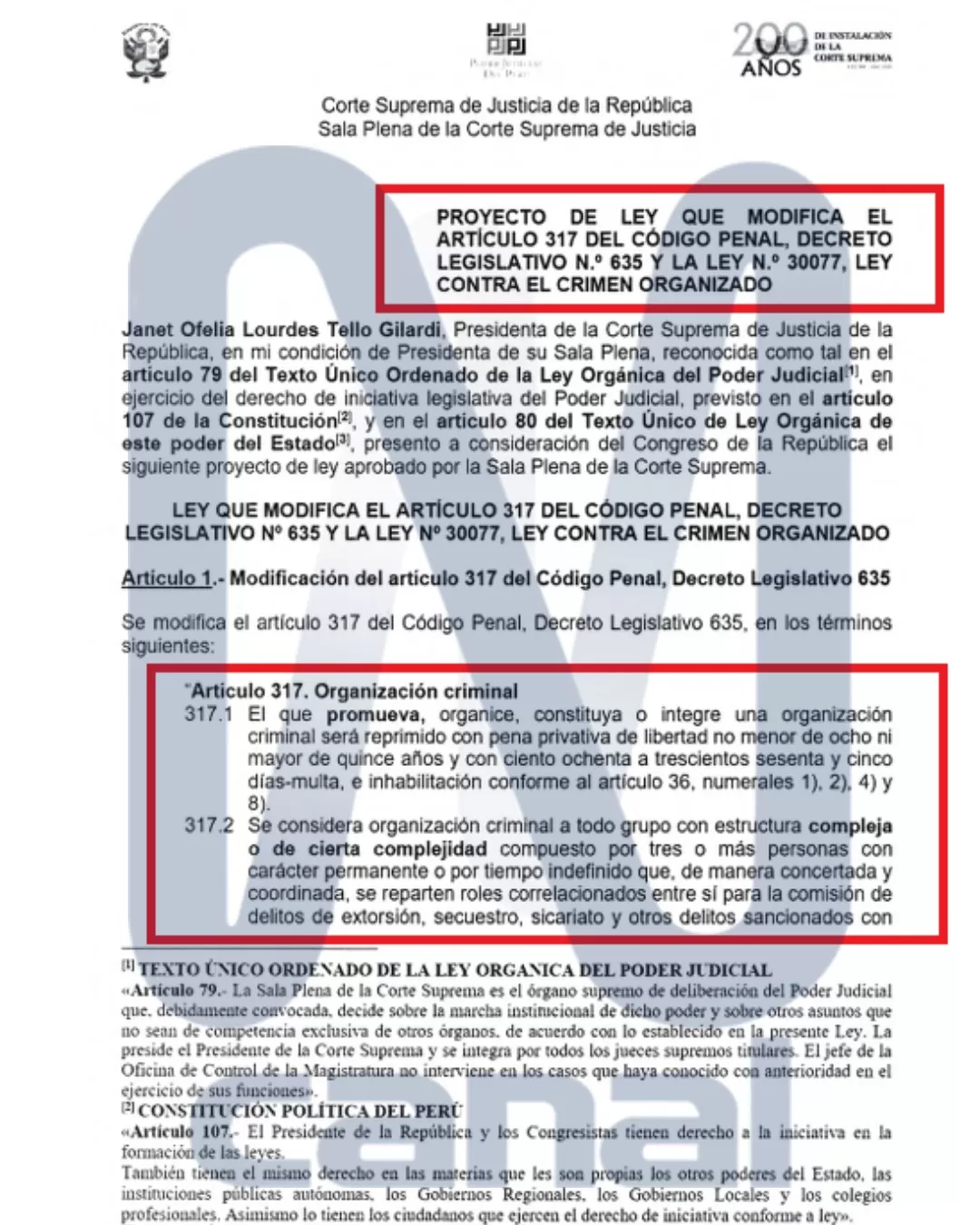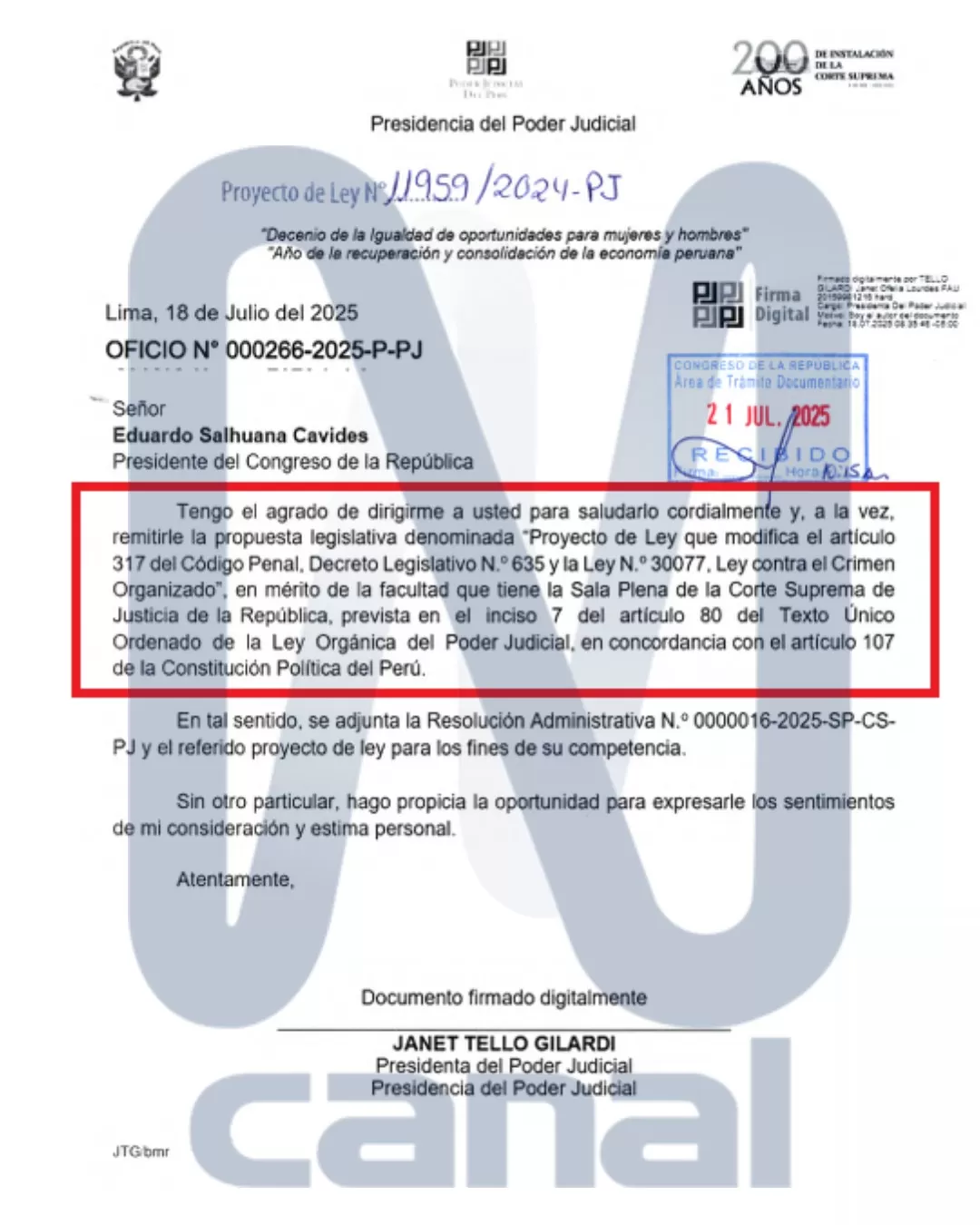 El Poder Judicial de Perú presentó oficialmente ante el Congreso el proyecto de ley 11959‑2024‑PJ, que plantea revertir las modificaciones introducidas por las normas 32108 y 32138 a la Ley contra el Crimen Organizado y al artículo 317 del Código Penal.