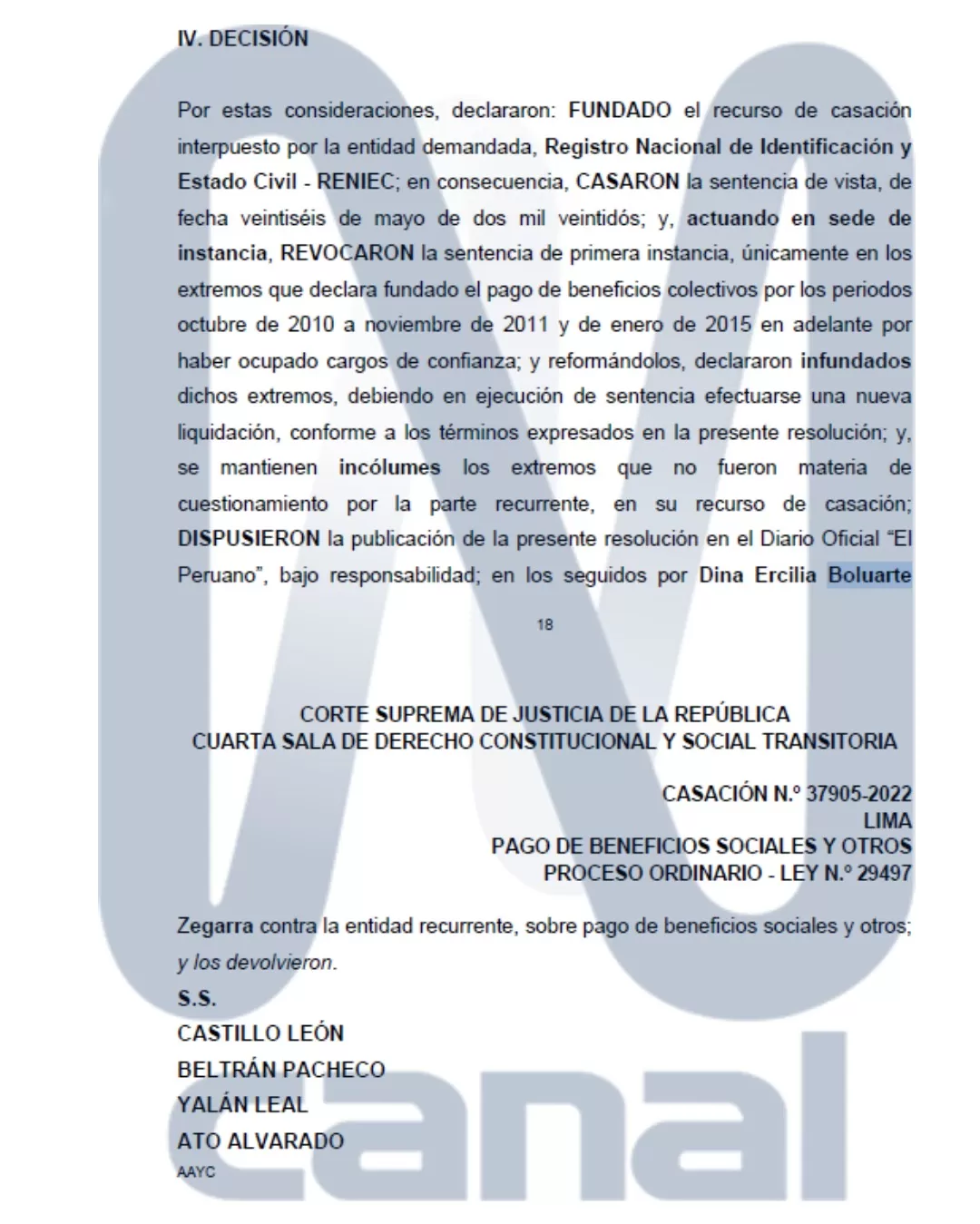 Sin embargo, el fallo de la Corte Suprema excluye del pago los beneficios colectivos correspondientes a los periodos en que Boluarte se desempeñó como Jefa de Oficina Registral, al considerar que ese cargo califica como de confianza. Por tanto, se ordenó realizar una nueva liquidación que excluya dichos periodos.