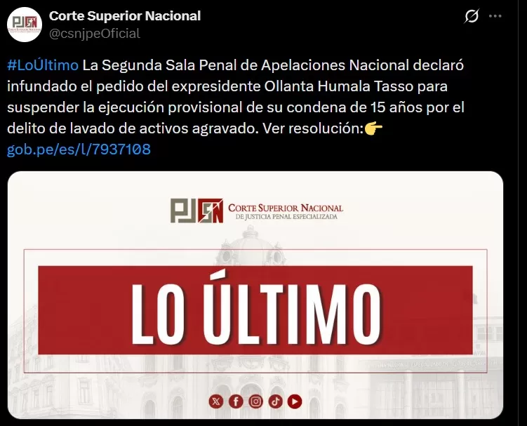 La Segunda Sala Penal de Apelaciones Nacional declaró infundado el pedido del expresidente Ollanta Humala Tasso para suspender la ejecución provisional de su condena de 15 años de prisión efectiva por el delito de lavado de activos agravado.