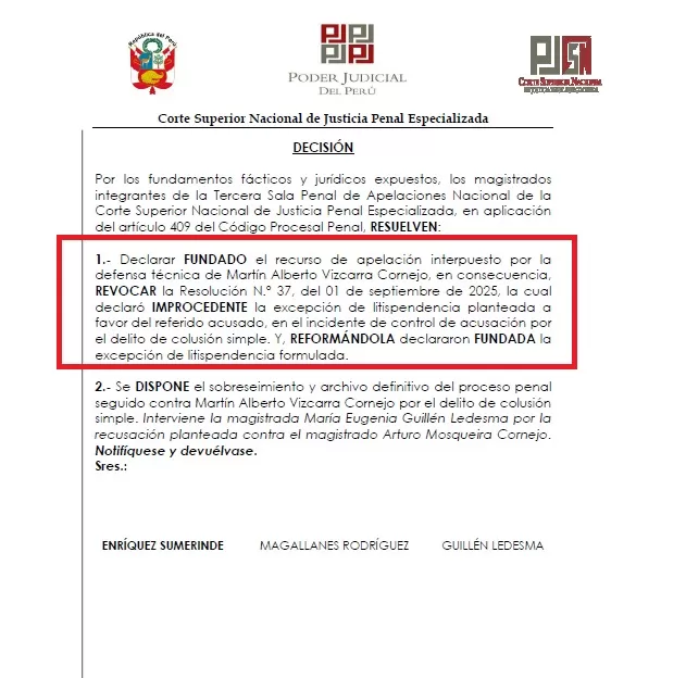 El Poder Judicial declaró fundada la excepción de litispendencia en el caso de Martín Vizcarra y archivó el proceso penal por colusión simple. La Sala de Apelaciones determinó que los hechos ya fueron juzgados bajo el delito de cohecho, y que no existía sustento fáctico para una segunda imputación. Se aceptó la aplicación supletoria del Código Procesal Civil ante un vacío legal. En paralelo, el recurso de apelación contra la sentencia por cohecho pasivo propio fue admitido. La defensa solicita su absolución y excarcelación. El caso será revisado por la Sala Penal de Apelaciones Nacional en segunda instancia.