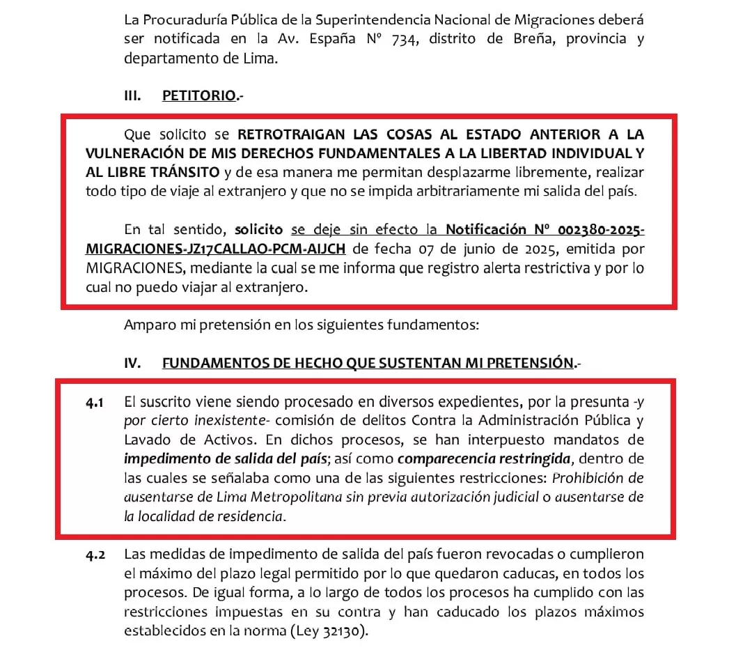 La acción legal fue interpuesta contra la Superintendencia Nacional de Migraciones. En el recurso, el exmandatario alega que la restricción no tenía base legal vigente al momento del hecho y que no fue notificado con ninguna resolución judicial que le impidiera salir del país.