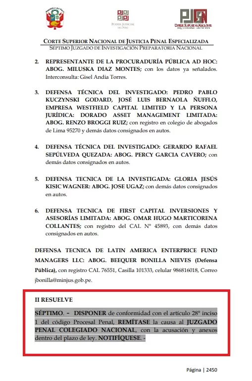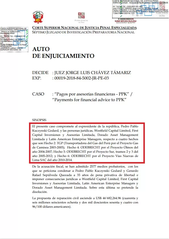 El Poder Judicial dispuso el inicio de juicio oral contra el expresidente Pedro Pablo Kuczynski (PPK) en el proceso penal por presunto lavado de activos, vinculado al caso Westfield Capital. El Séptimo Juzgado de Investigación Preparatoria Nacional dio por concluida la etapa de investigación y remitió el expediente a un Juzgado Penal Colegiado para su juzgamiento.