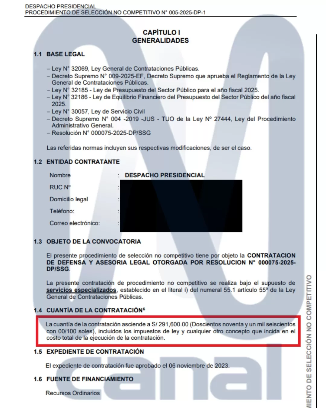 Pese al contexto, el Ejecutivo sustentó la contratación en el literal i) del numeral 55.1 del artículo 55º de la Ley General de Contrataciones Públicas, que permite contrataciones no competitivas en casos de servicios especializados. El expediente fue aprobado el 6 de noviembre de 2023 con cargo a recursos ordinarios.