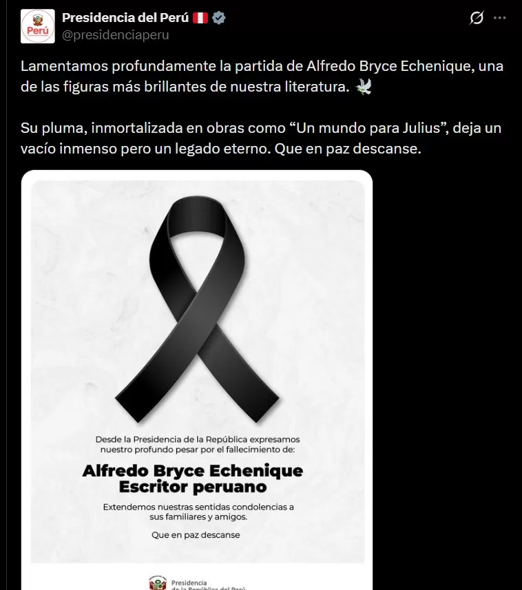 En su pronunciamiento, la Presidencia señaló que el escritor fue una de las figuras más brillantes de la narrativa peruana. También resaltó que su obra dejó una huella significativa en la literatura.