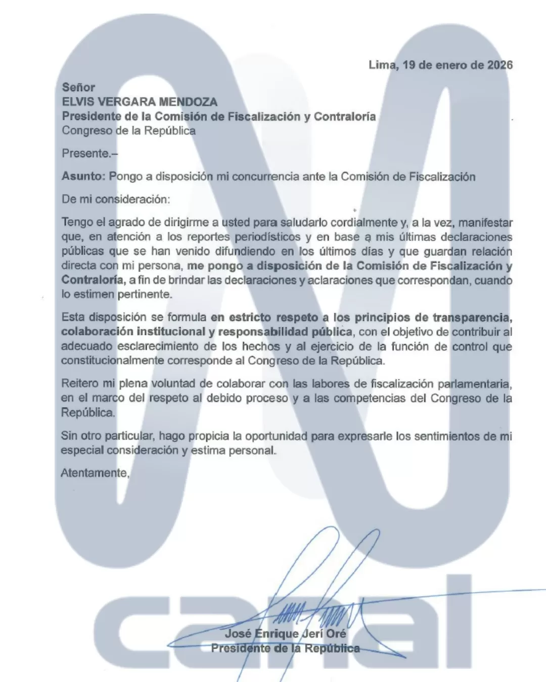 Este lunes, José Jerí remitió también una carta al presidente de la Comisión de Fiscalización del Congreso, Elvis Vergara, en la que manifiesta su disponibilidad para comparecer ante dicho grupo de trabajo parlamentario. En el documento, el mandatario reitera su voluntad de aclarar los hechos relacionados con las reuniones mencionadas en reportes de prensa.