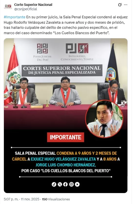 El Poder Judicial emitió la primera sentencia en juicio oral del caso Cuellos Blancos, condenando al exjuez Hugo Velásquez a nueve años y dos meses de prisión por cohecho pasivo específico. También fue inhabilitado por siete años y medio. El abogado Jorge Luis Chombo fue sentenciado a ocho años como cómplice primario. Ambos deberán pagar 80 mil soles de reparación civil al Estado. La condena se basa en la gestión irregular para contratar al hermano del exjuez en la Corte del Callao. La Fiscalía considera este fallo un avance en la investigación sobre corrupción judicial revelada en 2018.