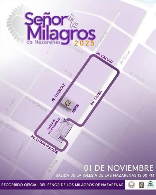 Posteriormente, retornará por la avenida Tacna hacia el Monasterio de las Nazarenas, donde permanecerá hasta el próximo año. La ruta ha sido diseñada para facilitar el tránsito de fieles en zonas emblemáticas del centro capitalino.