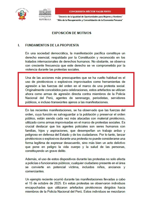 La exposición de motivos argumenta que el uso de pirotécnicos con fines violentos se ha vuelto frecuente en manifestaciones recientes. Se cita el caso del 15 de octubre de 2025, cuando individuos encapuchados dispararon artefactos explosivos contra miembros de la Policía Nacional del Perú.